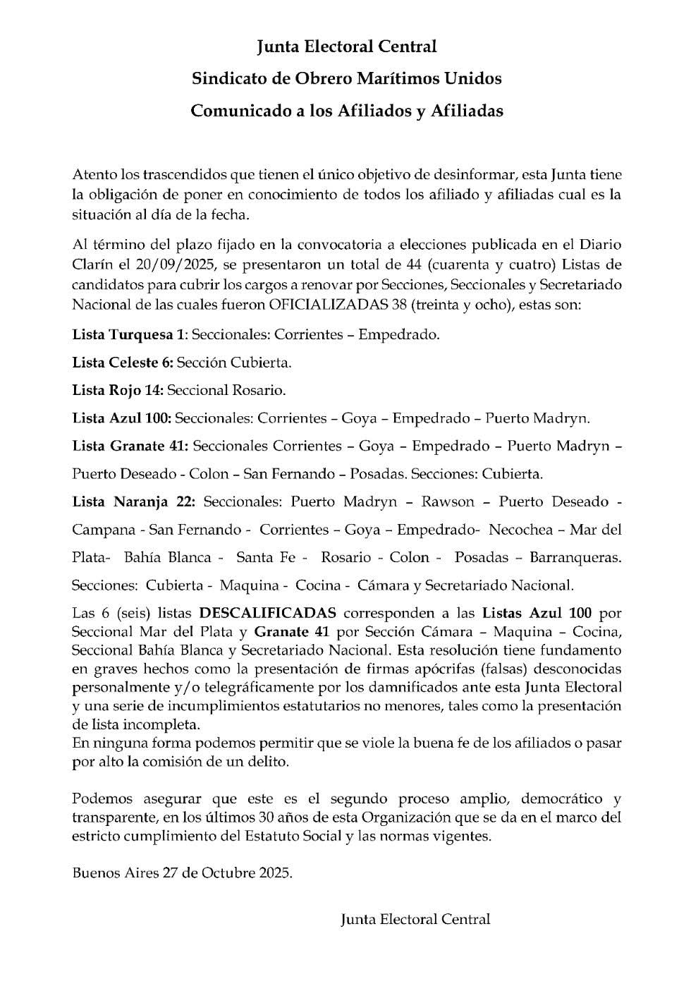 Según el informe, al cierre del plazo establecido en la convocatoria publicada el 20 de septiembre de 2025 en el diario Clarín, se presentaron un total de 44 listas de candidatos para renovar cargos en Secciones, Seccionales y el Secretariado Nacional. De ellas, 38 fueron oficializadas y 6 descalificadas por distintos incumplimientos estatutarios y la detección de firmas falsas.