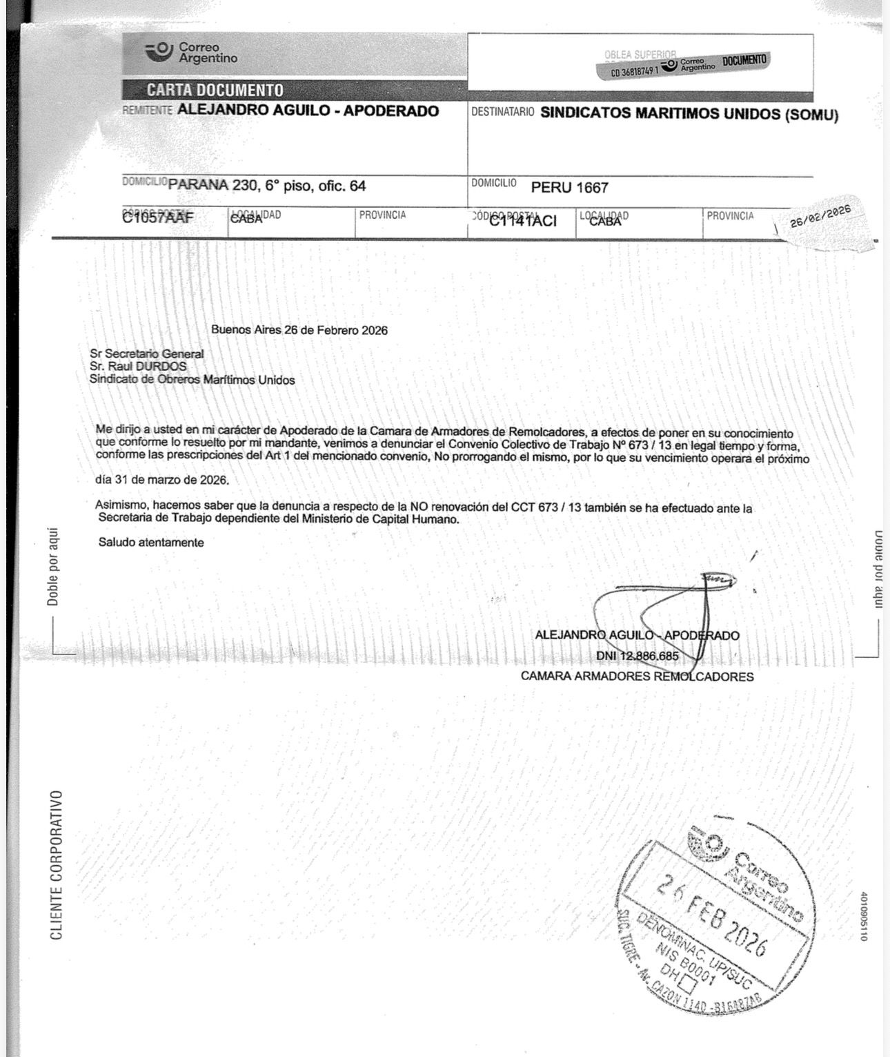 La Cámara Argentina de Remolcadores (CAR) envió una carta documento al Sindicato de Obreros Marítimos Unidos para romper de manera unilateral el convenio colectivo de la actividad. El gremio denunció una maniobra “provocativa” y se declaró en estado de alerta. Crece la tensión en el sector marítimo en medio del ajuste impulsado por el Gobierno nacional.