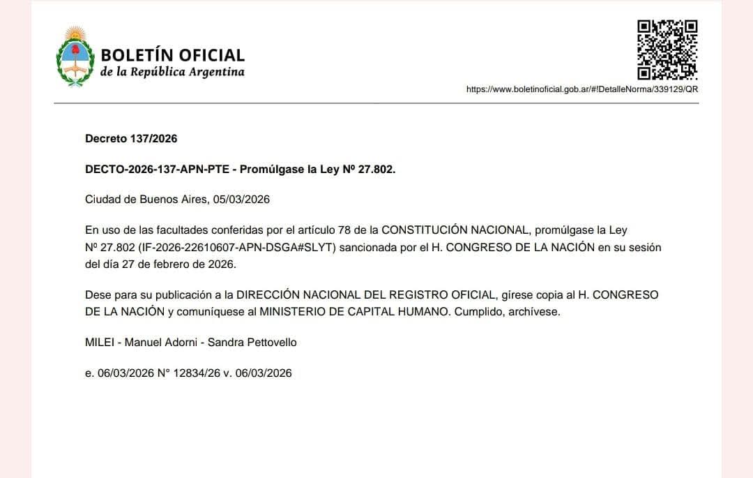 Otro de los aspectos contemplados es la implementación optativa de un Fondo de Cese Laboral, que podría utilizarse como alternativa para afrontar las indemnizaciones en casos de desvinculación laboral. En el documento oficial se señala que la promulgación se realiza “en uso de las facultades conferidas por el artículo 78 de la Constitución Nacional”, dejando formalmente vigente la norma aprobada por el Congreso el pasado 27 de febrero de 2026. La reforma forma parte de un paquete de medidas impulsadas por el Poder Ejecutivo con el objetivo de modificar el marco regulatorio del mercado de trabajo.