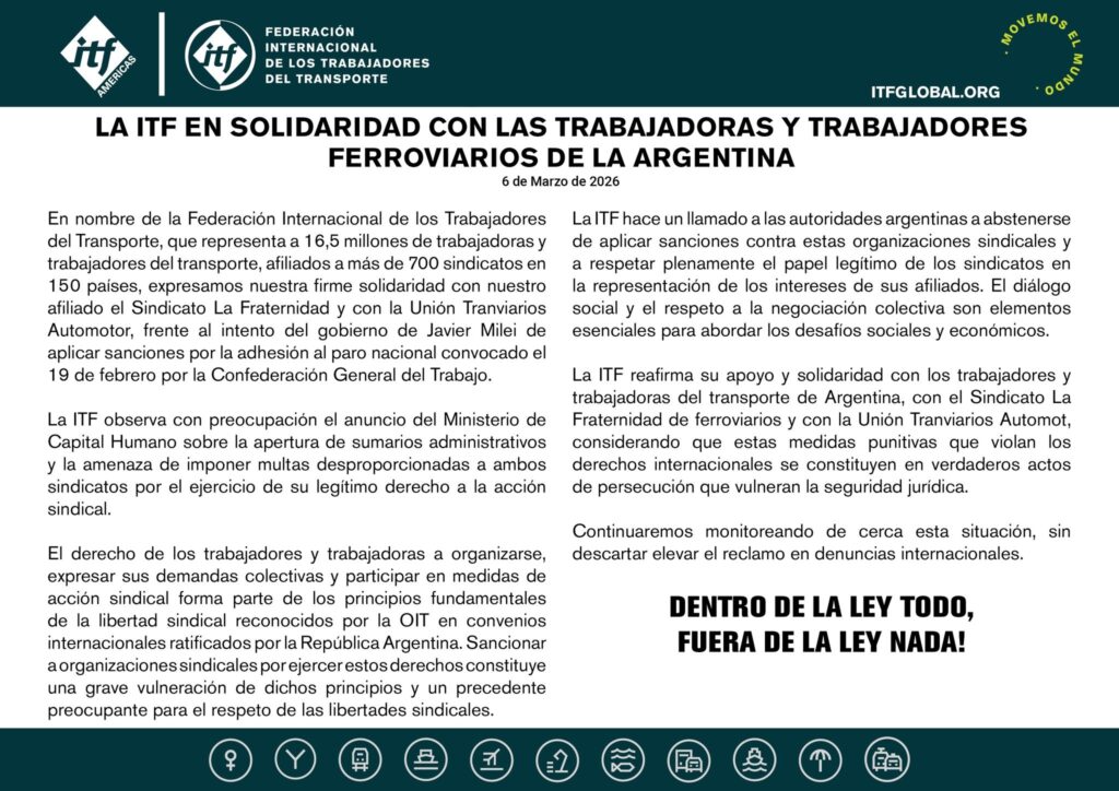 En ese sentido, la ITF advirtió que observa con inquietud la decisión oficial de avanzar con sanciones económicas contra las organizaciones sindicales por su participación en el paro nacional, al considerar que se trata de un derecho reconocido en el marco de la actividad gremial.