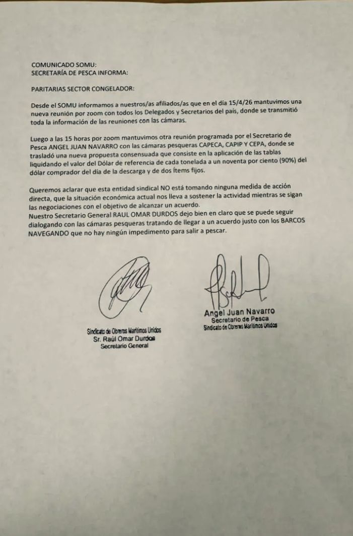Sin embargo, el trasfondo de la negociación deja al descubierto una tensión latente: mientras los trabajadores buscan recomponer salarios golpeados, las cámaras empresarias insisten en esquemas que aten los costos a la evolución del mercado internacional y el tipo de cambio. A pesar de este escenario, desde el sindicato llevaron un mensaje de calma. “No se está tomando ninguna medida de acción directa”, aclararon en el comunicado oficial, remarcando que la prioridad inmediata es sostener la actividad y evitar una paralización de la flota congeladora.