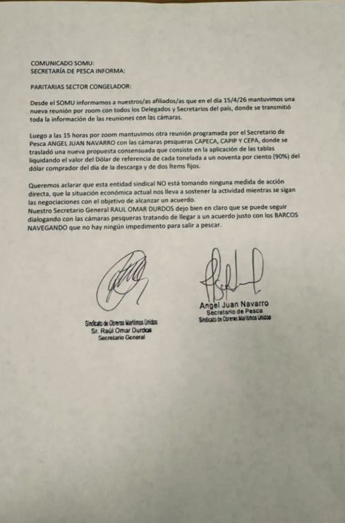 En ese contexto en un escenario marcado por la incertidumbre económica y la presión constante sobre los ingresos de los trabajadores, el Sindicato de Obreros Marítimos Unidos (SOMU) avanza en una compleja negociación paritaria con las principales cámaras del sector pesquero.