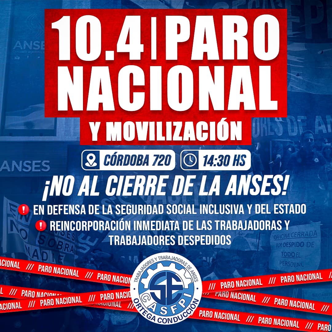 El secretario general del Sindicato de Empleados de la Ex Caja de Subsidios Familiares para el Personal de la Industria (SECASFPI), Carlos Ortega, ha confirmado la convocatoria a un paro nacional con movilización a la sede central de ANSES para el día de mañana, en respuesta a los despidos de 1.300 trabajadores del organismo bajo el gobierno de Javier Milei.