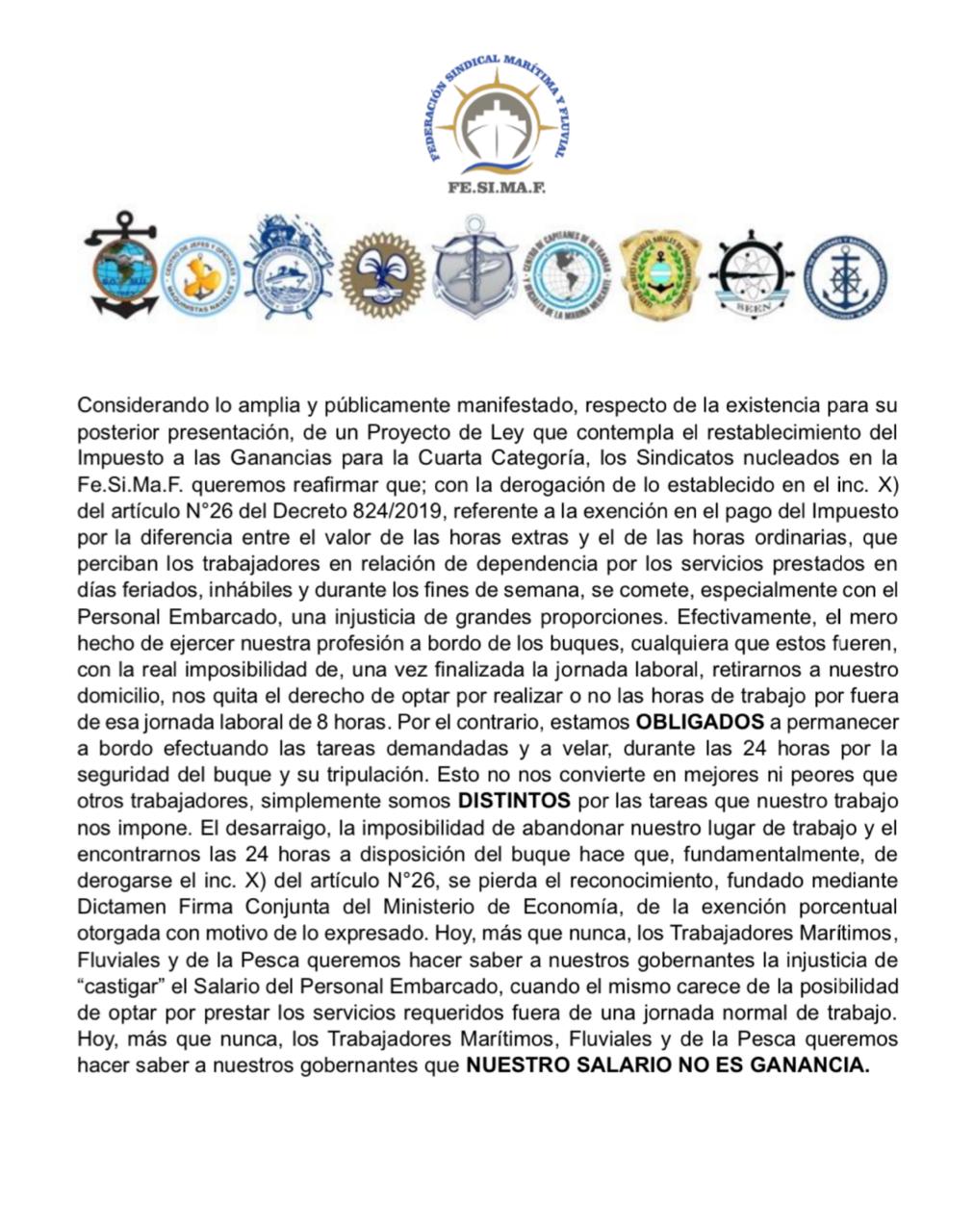 En un importante comunicado emitido por los sindicatos que integran la Federación Sindical Marítima y Fluvial Fe.Si.Ma.F, se expresó la preocupación y el rechazo ante la posibilidad de restablecer el Impuesto a las Ganancias para la Cuarta Categoría, específicamente en lo referente a la exención en el pago del impuesto por la diferencia entre el valor de las horas extras y las horas ordinarias de los trabajadores en relación de dependencia que prestan servicios en días feriados, inhábiles y fines de semana.