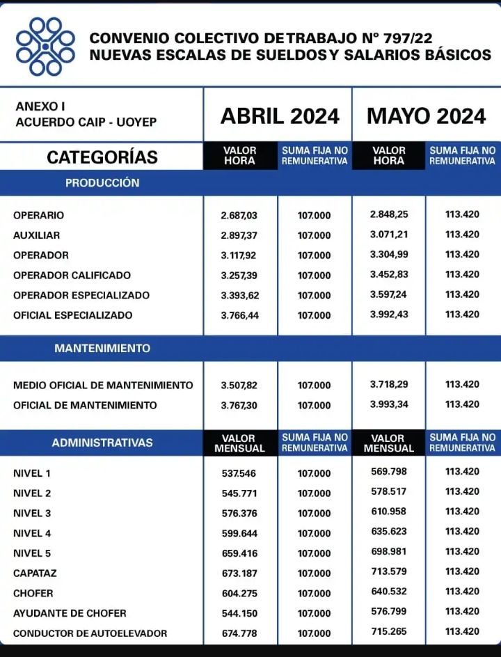 El gremio liderado por Alberto Oscar Múrua, la Unión Obrera y Empleados del Plástico (UOYEP), ha alcanzado un nuevo acuerdo con la Cámara Argentina de la Industria del Plástico (CAIP) que establece un aumento salarial del 7% al sueldo básico en abril y otro 6% en mayo, aplicables respecto al mes anterior en cada caso.