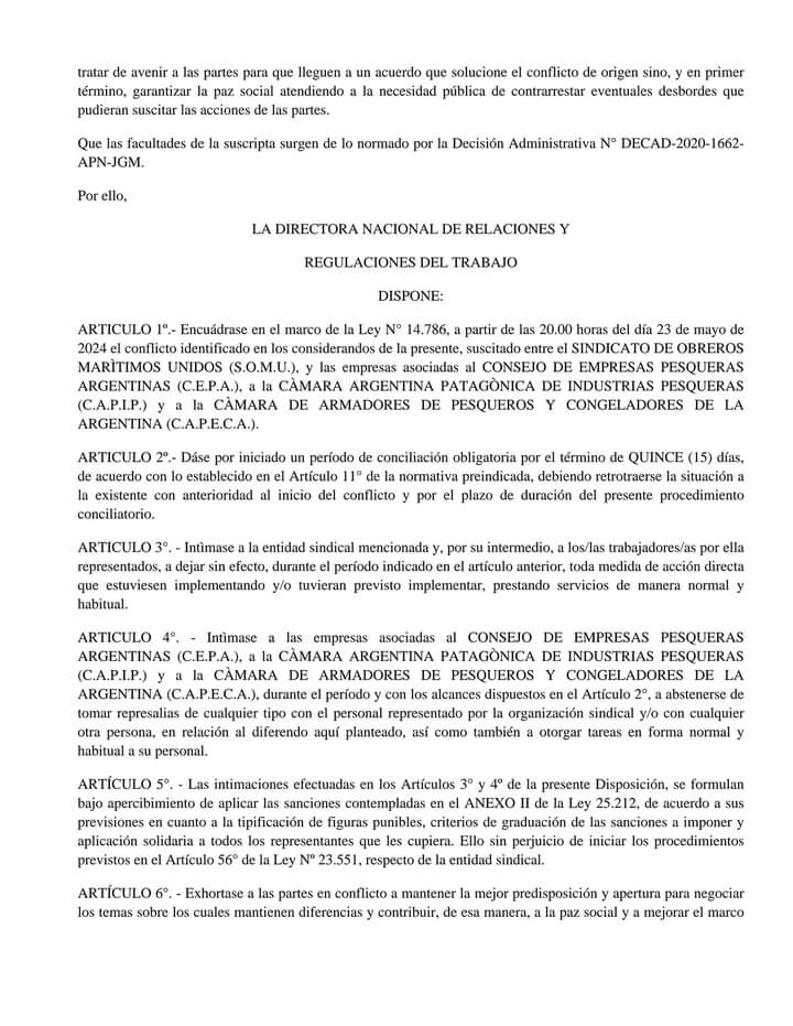 Ministerio de Trabajo Nación Dicta Conciliación Obligatoria en Conflicto entre SOMU y Cámaras Pesqueras