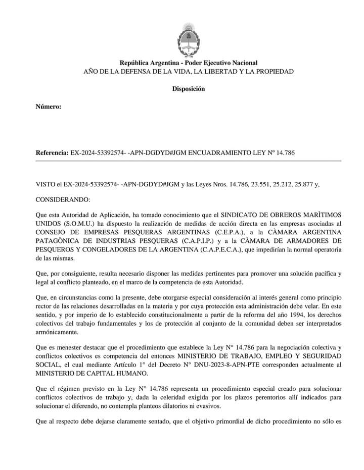 En el marco de un conflicto laboral que ha generado tensiones en el sector pesquero, el Ministerio de Trabajo de la Nación ha intervenido dictando Conciliación Obligatoria para el Sindicato de Obreros Marítimos Unidos (SOMU) y todas las Cámaras Pesqueras, respecto a las medidas que se estaban llevando a cabo en los diferentes puertos del país.