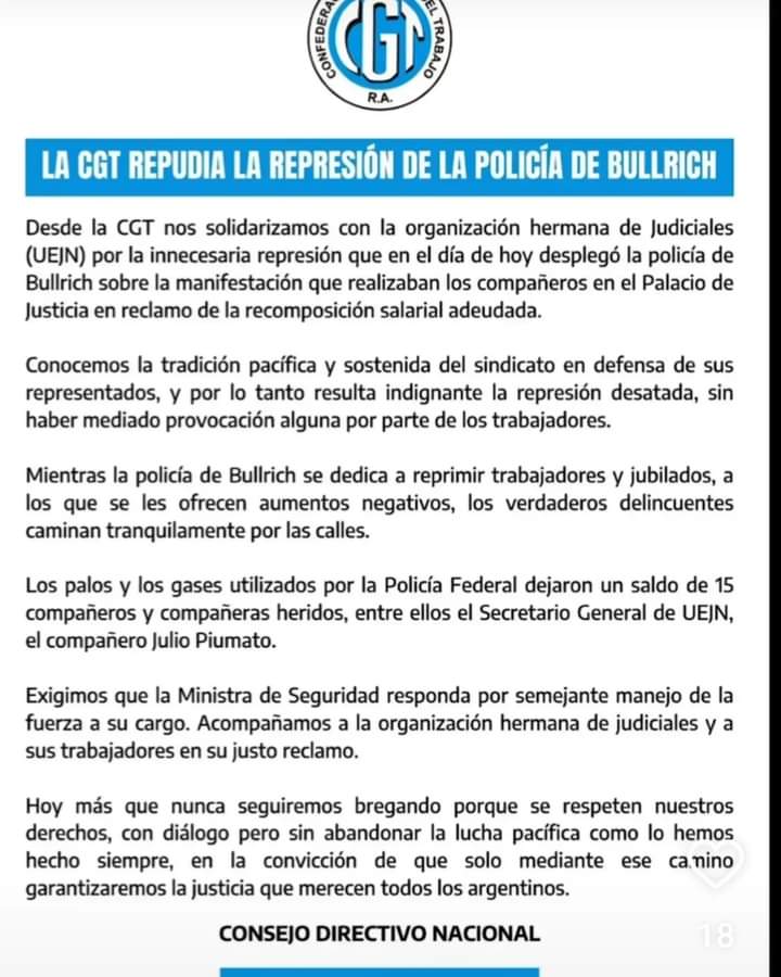 En ese contexto el consejo directivo de la CGT manifestó su solidaridad con la organización de Judiciales (UEJN) ante estos hechos de violencia injustificada. La represión desplegada por la policía de Bullrich en el marco de una protesta legítima y pacífica demuestra una clara falta de diálogo y respeto hacia los reclamos legítimos de los trabajadores, generando un clima de tensión y violencia que no contribuye a la resolución de los conflictos laborales.
