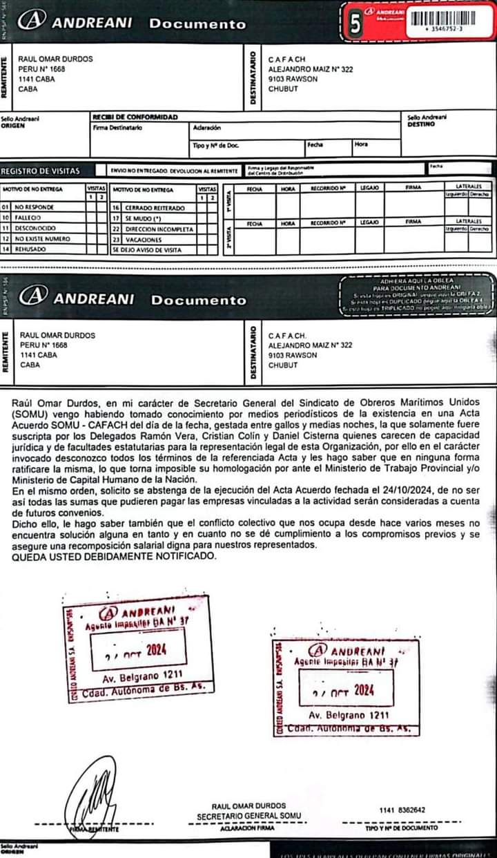 Cabe señalar que en la carta Documento con fecha 24 de octubre enviada por Raúl Omar Durdos deja en claro que no ratificará los términos del acta firmada, lo que imposibilitarÃa su homologación ante el Ministerio de Trabajo de Chubut y el Ministerio de Capital Humano de la Nación. "Desconozco todos los términos de la referenciada acta y les hago saber que en ninguna forma ratificaré la misma", señaló,Durdos instando a la Cámara a abstenerse de ejecutar el acuerdo alcanzado. Asimismo, advirtió que cualquier suma de dinero que las empresas vinculadas a la actividad pudieran pagar será considerada a cuenta de futuros convenios.