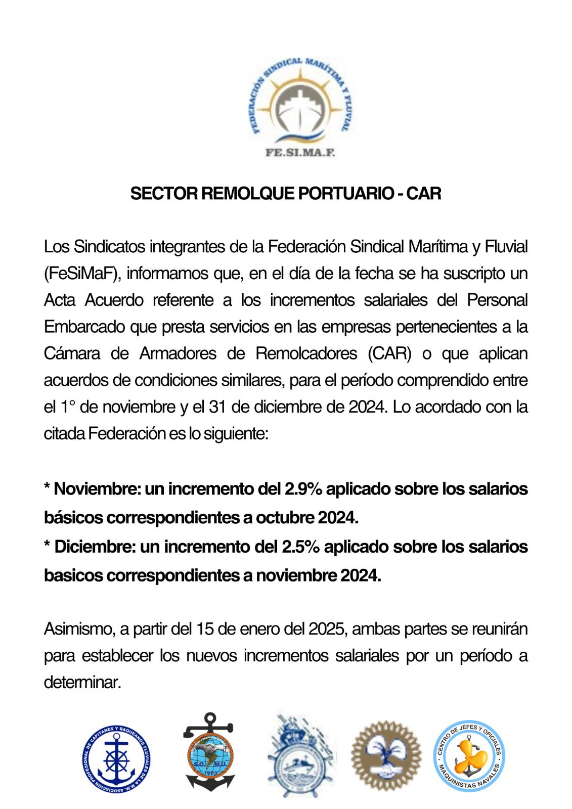 La Federación Sindical Marítima y Fluvial (FeSiMaF), bajo la conducción de Raúl Omar Durdos, ha hecho público un acuerdo que establece un incremento salarial para el personal embarcado del Sector de Remolque Portuario-Cámara de Armadores de Remolcadores (CAR).