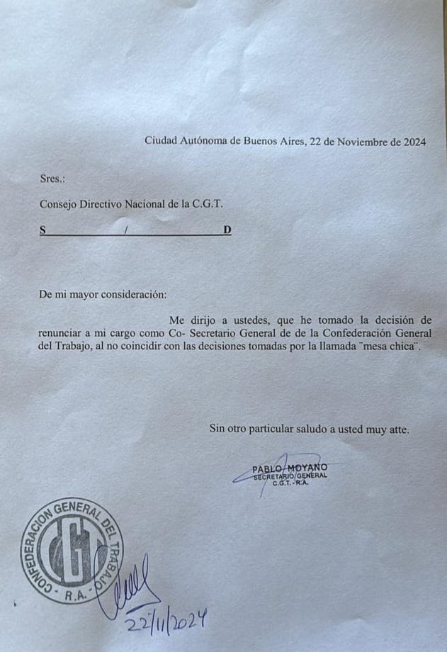 En ese marco Pablo Moyano, quien ha sido una figura clave en la CGT desde 2021, hab�a condicionado su permanencia en el triunvirato a la reacci�n del movimiento obrero frente al Gobierno. En declaraciones previas al paro de transporte del 30 de octubre, hab�a expresado que ?la mitad de la CGT quiere dialogar con el Gobierno y la otra mitad quiere estar en la calle para defender los derechos de los trabajadores?. Esta divisi�n refleja una crisis de liderazgo y direcci�n en la central obrera, donde las posturas sobre c�mo enfrentar la situaci�n actual del pa�s var�an significativamente entre los diferentes sectores.