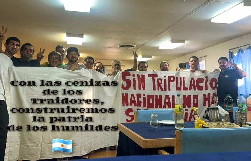 En una contundente muestra de resistencia, trabajadores del Sindicato de Obreros Marítimos Unidos (SOMU), liderados por Raúl Omar Durdos, realizaron un banderazo en la marina con la consigna "Con las cenizas de los traidores construiremos la patria de los humildes".