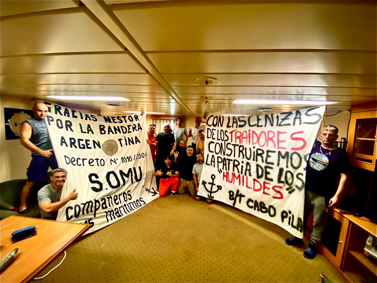 En una contundente muestra de resistencia, trabajadores del Sindicato de Obreros Marítimos Unidos (SOMU), liderados por Raúl Omar Durdos, realizaron un banderazo en la marina con la consigna "Con las cenizas de los traidores construiremos la patria de los humildes".