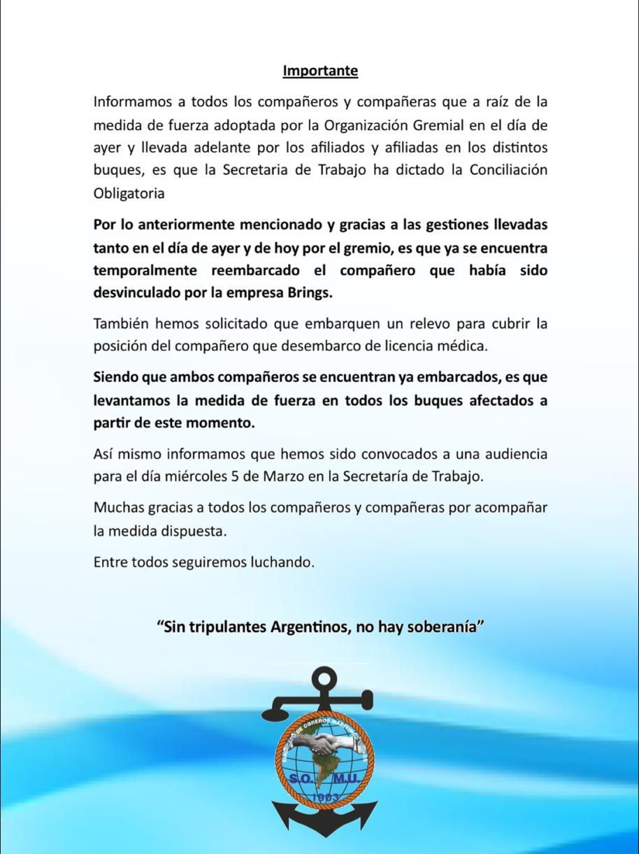 En el comunicado, el SOMU señala que, tras la medida de fuerza realizada el día anterior, la Secretaría de Trabajo ha dictado la Conciliación Obligatoria. Esto representa un paso crucial para resolver el conflicto laboral que se había generado, especialmente en relación con el despido de un compañero que había sido desvinculado por la empresa Brings. Gracias a las gestiones realizadas por el gremio, el compañero ya se encuentra temporalmente reembarcado. Además, el sindicato ha solicitado que se embarque un relevo para cubrir la posición del compañero que había desembarcado por licencia médica. Con ambos trabajadores ya embarcados, el SOMU ha decidido levantar la medida de fuerza en todos los buques afectados, a partir de este momento. El comunicado también informa que el sindicato ha sido convocado a una audiencia en la Secretaría de Trabajo para el día miércoles 5 de marzo, lo que indica que el proceso de diálogo y negociación sigue en marcha.