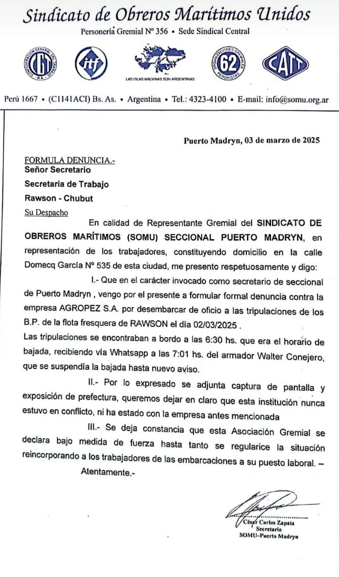 En ese marco Los marineros, respaldados por el Sindicato de Obreros Marítimos Unidos (SOMU), se presentaron ante la empresa para exigir que se respetara su derecho a celebrar su día. Sin embargo, a pesar de su solicitud, la empresa intentó forzarlos a salir a navegar, lo que llevó a los trabajadores a negarse y a actuar en defensa de sus derechos. En un giro inesperado y por orden de la empresa, Conarpesa decidió despedir a los marineros de manera unilateral. Hoy, se procederá al desembarco forzado de los trabajadores en el puerto a las 19 horas, donde se les comunicó que pueden retirar sus libretas en portería, en Rawson. En ese sentido desde el Sindicato de Obreros Marítimos Unidos SOMU conducido por Raúl Omar Durdos. Se realizó una presentación en la Secretaría de Trabajo donde se denunció que la empresa AGROPEZ S.A desembarco de oficio a más de 80 marineros de la flota fresquera de RAWSON.