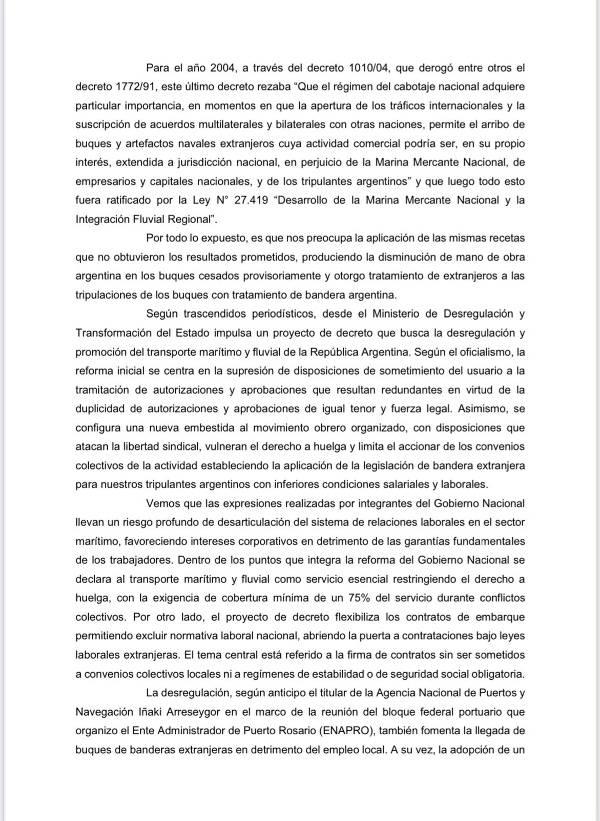 Además los legisladores advierten que la nueva normativa podrÃa desarticular el sistema de relaciones laborales en el ámbito marÃtimo, favoreciendo intereses corporativos a costa de las garantÃas fundamentales de los trabajadores. Particularmente alarmante es la declaración del transporte marÃtimo y fluvial como un "servicio esencial", que, según los diputados, restringe el derecho a huelga y establece la obligación de mantener un 75% de cobertura del servicio durante conflictos laborales.