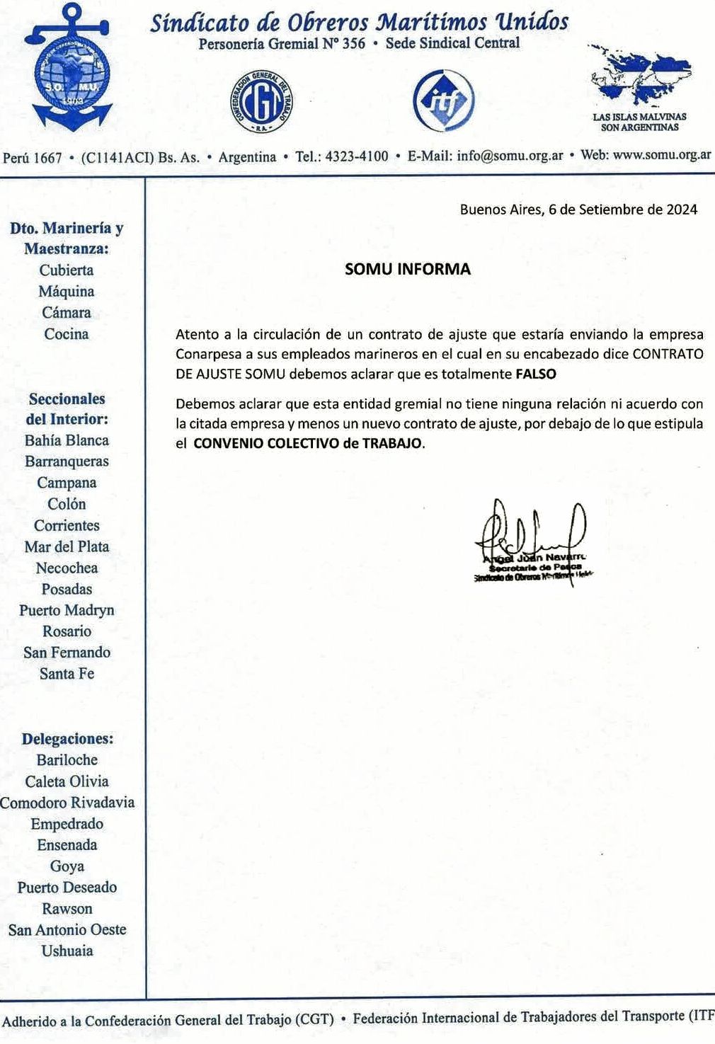 El Sindicato de Obreros Marítimos Unidos (SOMU), liderado por Raúl Durdos, ha denunciado públicamente que la empresa Conarpesa está haciendo circular un contrato de ajuste entre sus empleados marineros, el cual lleva en su encabezado la leyenda "CONTRATO DE AJUSTE SOMU". Ante esta situación, la entidad gremial ha emitido un comunicado en el que aclara que dichos contratos son completamente apócrifos y carecen de validez.
