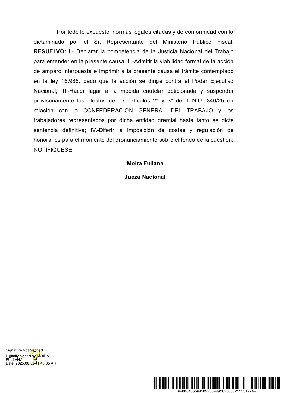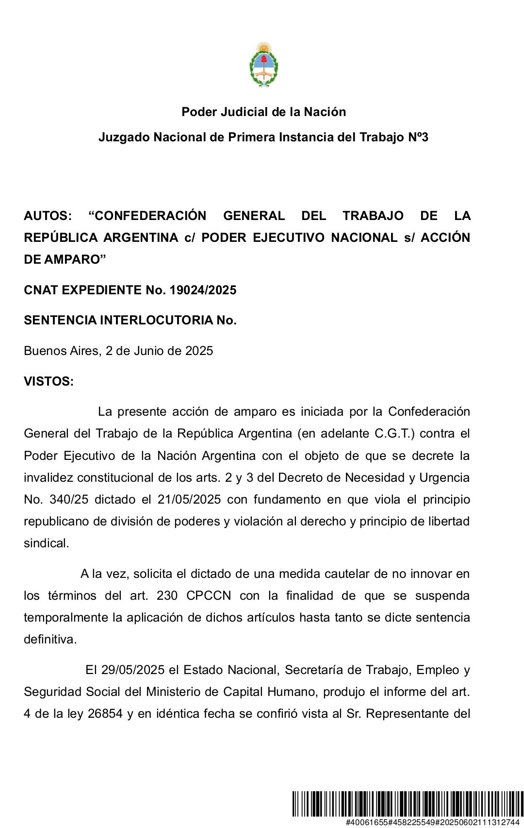 El Juzgado Nacional de Primera Instancia del Trabajo N° 3 a cargo de la Jueza Moira Fullana ha dictado una resolución en el marco de la acción de amparo presentada por la Confederación General del Trabajo de la República Argentina (C.G.T.) contra el Poder Ejecutivo Nacional. La medida suspende temporalmente los efectos de los artículos 2 y 3 del Decreto de Necesidad y Urgencia No. 340/25, promulgado el 21 de mayo de 2025, por considerar que violan derechos fundamentales, incluyendo la libertad sindical.