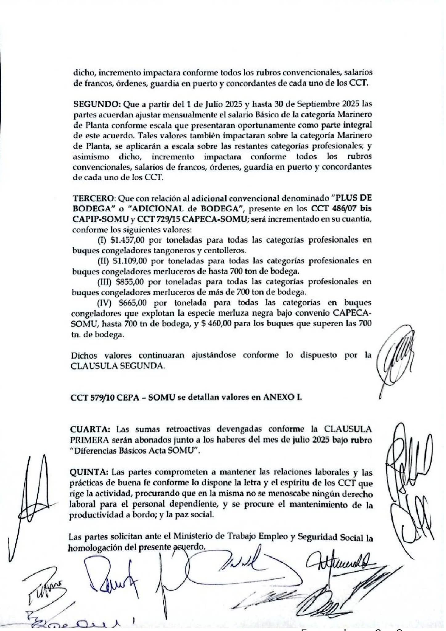 En ese sentido el entendimiento firmado en el día de hoy establece que desde el 1 de abril hasta el 1 de octubre se ajustarán los salarios, y el retroactivo correspondiente a los meses de abril, mayo y junio será liquidado junto con el salario de julio. Además, se abordó la cuestión de la mala liquidación del mes de junio, comprometiéndose a hacer el reclamo necesario para garantizar que cada tripulante reciba lo adeudado de forma inmediata. Otro punto relevante del acuerdo es la recomposición del ítem de Bodega Completa, que se ajustará en la misma proporción acordada para los salarios básicos. Juan Navarro, secretario de Pesca, expresó a mundo sindical su satisfacción por el resultado y afirmó: "Dimos un paso muy importante al destrabar el conflicto de los salarios básicos. Solicitamos a las empresas que saquen los barcos a pescar, y por lo tanto, en el día de hoy levantamos la medida; no hay ningún impedimento para que las empresas operen sin necesidad de firmar contratos de ajuste con valores inferiores a los establecidos convencionalmente". Cabe señalar que la cartera laboral del Ministerio de Capital Humano también convocó a las partes a una nueva audiencia el próximo lunes 14 de julio, lo que refleja la disposición del gobierno para mediar en el conflicto. Desde la dirigencia del SOMU, se reiteró el compromiso de mantener un diálogo constante y buscar alternativas viables, como alivios fiscales, que permitan la sostenibilidad y sustentabilidad de la actividad pesquera, sin menoscabar la dignidad y el sacrificio de los marineros pescadores. Cabe destacar que La firma de este acuerdo representa un paso significativo en la defensa de los derechos laborales del sector y la búsqueda de condiciones dignas para los trabajadores. Con el cese de actividades levantado, se espera que la actividad pesquera se reanude con normalidad, asegurando a su vez condiciones laborales justas y acordes con el esfuerzo que los trabajadores realizan en su día a día.