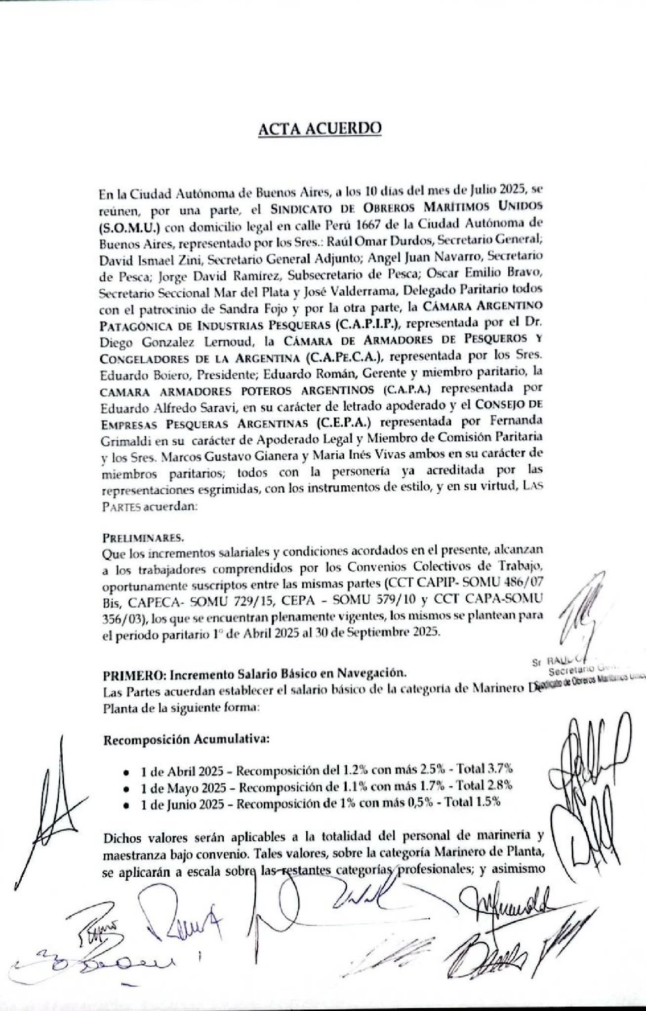 El Sindicato de Obreros Marítimos Unidos (SOMU), liderado por Raúl Durdos, anunció hoy la firma de un acuerdo que permitirá la recomposición de los salarios básicos de los Convenios Colectivos de Trabajo (CCT) 486/07 BIS, 729/15, 579/10 y 356/03. Este avance clave en las negociaciones llevó al levantamiento inmediato del cese de actividades que había sido implementado por los trabajadores.