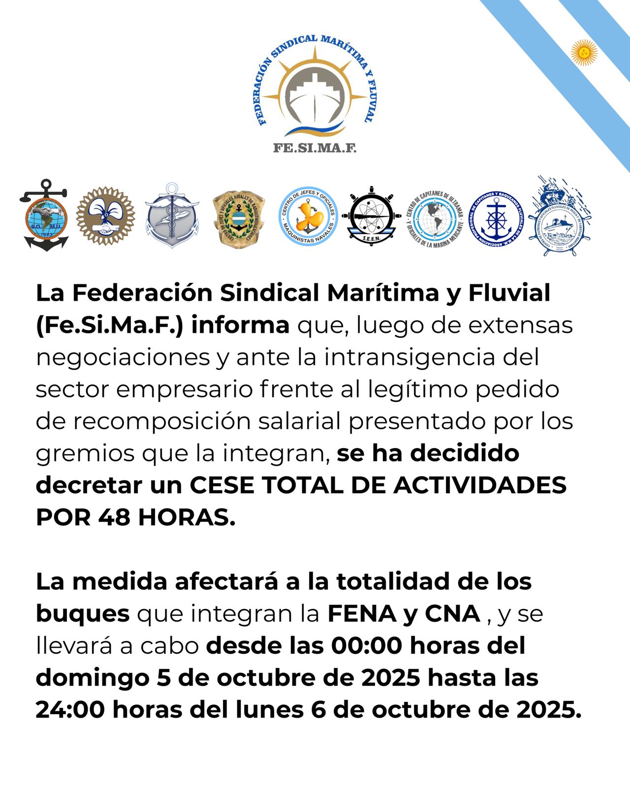 La Federación Sindical MarÃtima y Fluvial (Fe.Si.Ma.F.) confirmó la realización de un paro total de actividades por 48 horas, que se extenderá desde las 00:00 hs del domingo 5 hasta las 24:00 hs del lunes 6 de octubre de 2025, en reclamo de una recomposición salarial urgente para los trabajadores marÃtimos y fluviales.