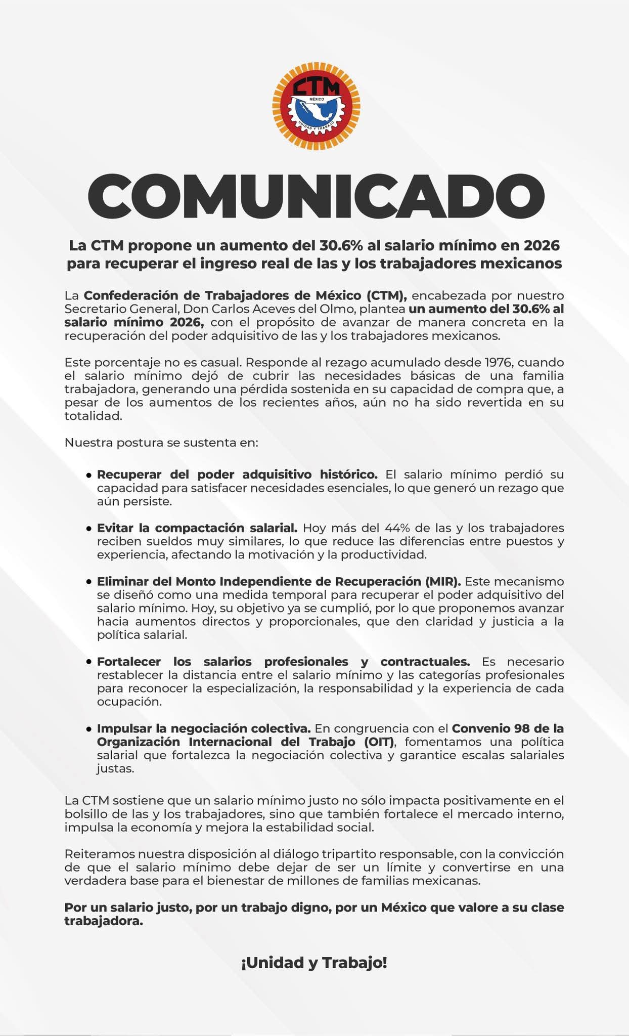 Desde la conducción encabezada por Carlos Aceves del Olmo, la CTM remarcó que, pese a los aumentos aplicados en los últimos años, la pérdida del poder de compra “aún no ha sido revertida en su totalidadâ€. En ese sentido, la central planteó que el ajuste propuesto es parte de una polÃtica integral destinada a mejorar la vida económica de millones de asalariados en todo el paÃs.