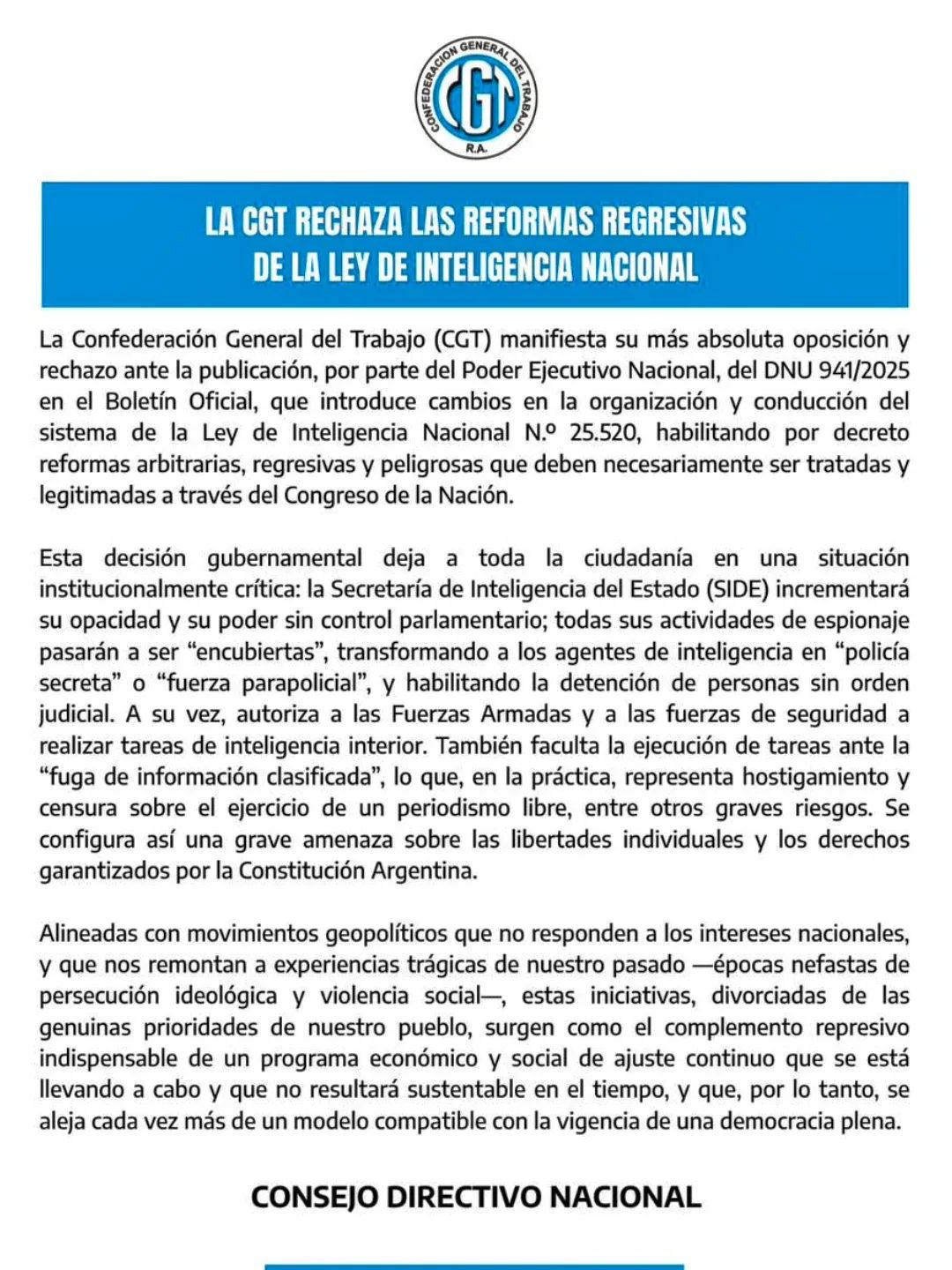 La Confederación General del Trabajo (CGT) expresó a través de un comunicado su más enérgico rechazo a las reformas introducidas por el Poder Ejecutivo Nacional mediante el Decreto de Necesidad y Urgencia 941/2025, que modifica aspectos centrales de la Ley de Inteligencia Nacional N.º 25.520. Para la central obrera, se trata de una decisión unilateral, regresiva y de extrema gravedad institucional que no puede ni debe ser legitimada por fuera del Congreso de la Nación. Desde la CGT señalaron que el decreto amplía de manera peligrosa las facultades de la Secretaría de Inteligencia del Estado (SIDE), incrementando su opacidad y eliminando controles esenciales. Según denunciaron, todas las actividades de inteligencia pasarían a tener carácter “encubierto”, configurando en los hechos la creación de una fuerza de espionaje con rasgos de policía secreta o parapolicial, con capacidad incluso de realizar detenciones sin orden judicial. La central sindical advirtió además que el DNU habilita a las Fuerzas Armadas y a las fuerzas de seguridad a realizar tareas de inteligencia interior, una práctica expresamente prohibida por el marco legal vigente y por los consensos democráticos construidos tras la última dictadura militar. “Este tipo de medidas nos retrotrae a las etapas más oscuras de nuestra historia”, remarcaron desde la conducción cegetista. Otro de los puntos más alarmantes, según la CGT, es la facultad otorgada al Estado para intervenir ante supuestas “fugas de información clasificada”, lo que en la práctica puede convertirse en un mecanismo de persecución, hostigamiento y censura contra el periodismo y la libertad de expresión. Para la central obrera, el decreto no es un hecho aislado, sino parte de un esquema más amplio: “Estas reformas se alinean con un modelo económico de ajuste permanente que requiere un andamiaje represivo para sostenerse”. En ese sentido, advirtieron que el camino elegido por el Gobierno se aleja cada vez más de los principios básicos de una democracia plena y pone en riesgo las libertades individuales consagradas en la Constitución Nacional.