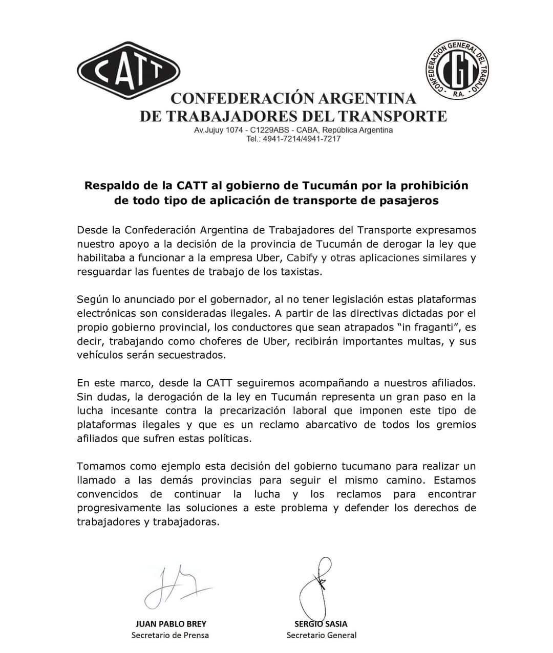 La CATT respaldo al gobierno de Tucumán por la prohibición de aplicaciones de pasajeros.